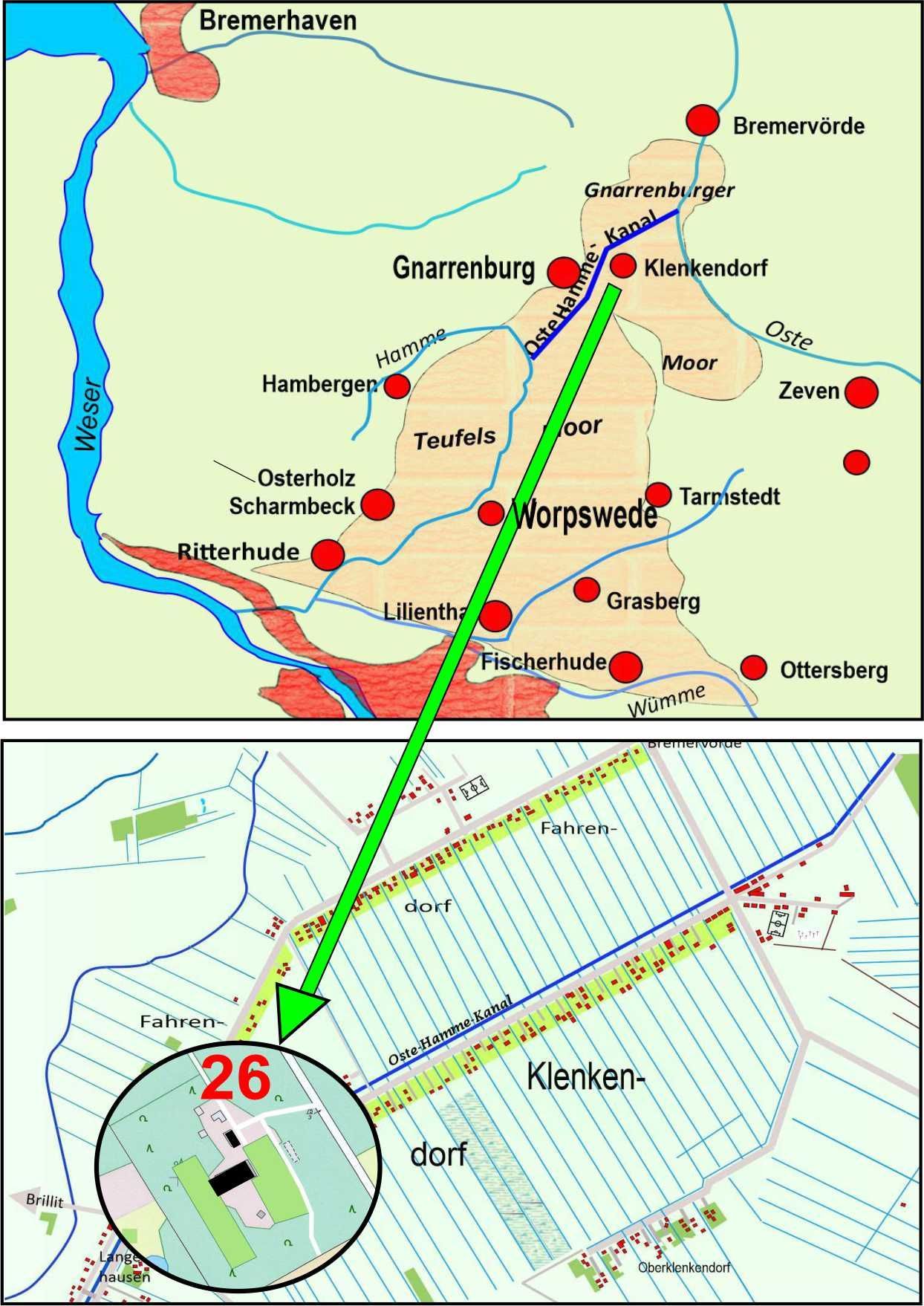 Das Waldgrundstück liegt im kleinen Moordorf Klenkendorf am Oste-Hamme-Kanal und gehört zur Gemeinde Gnarrenburg.